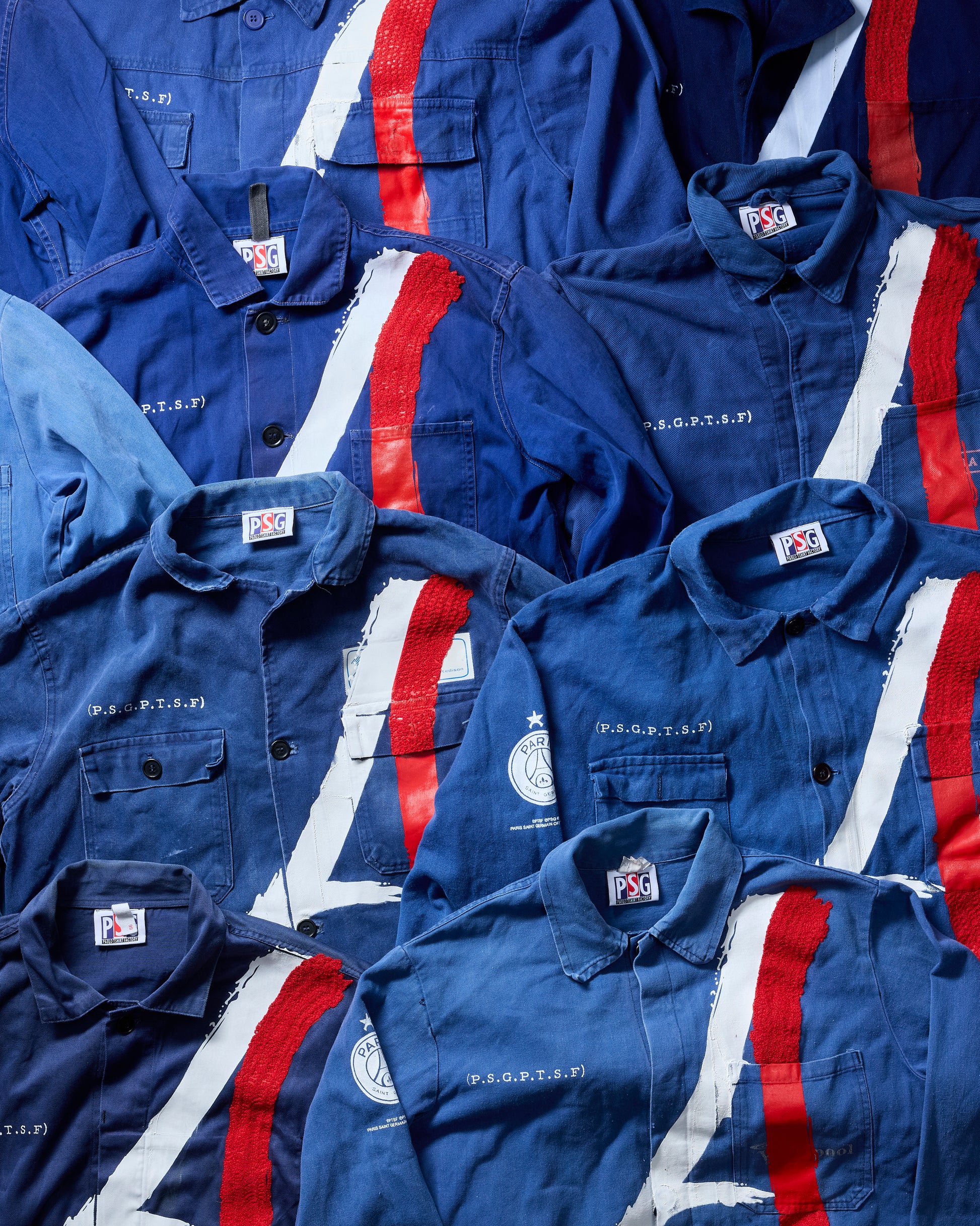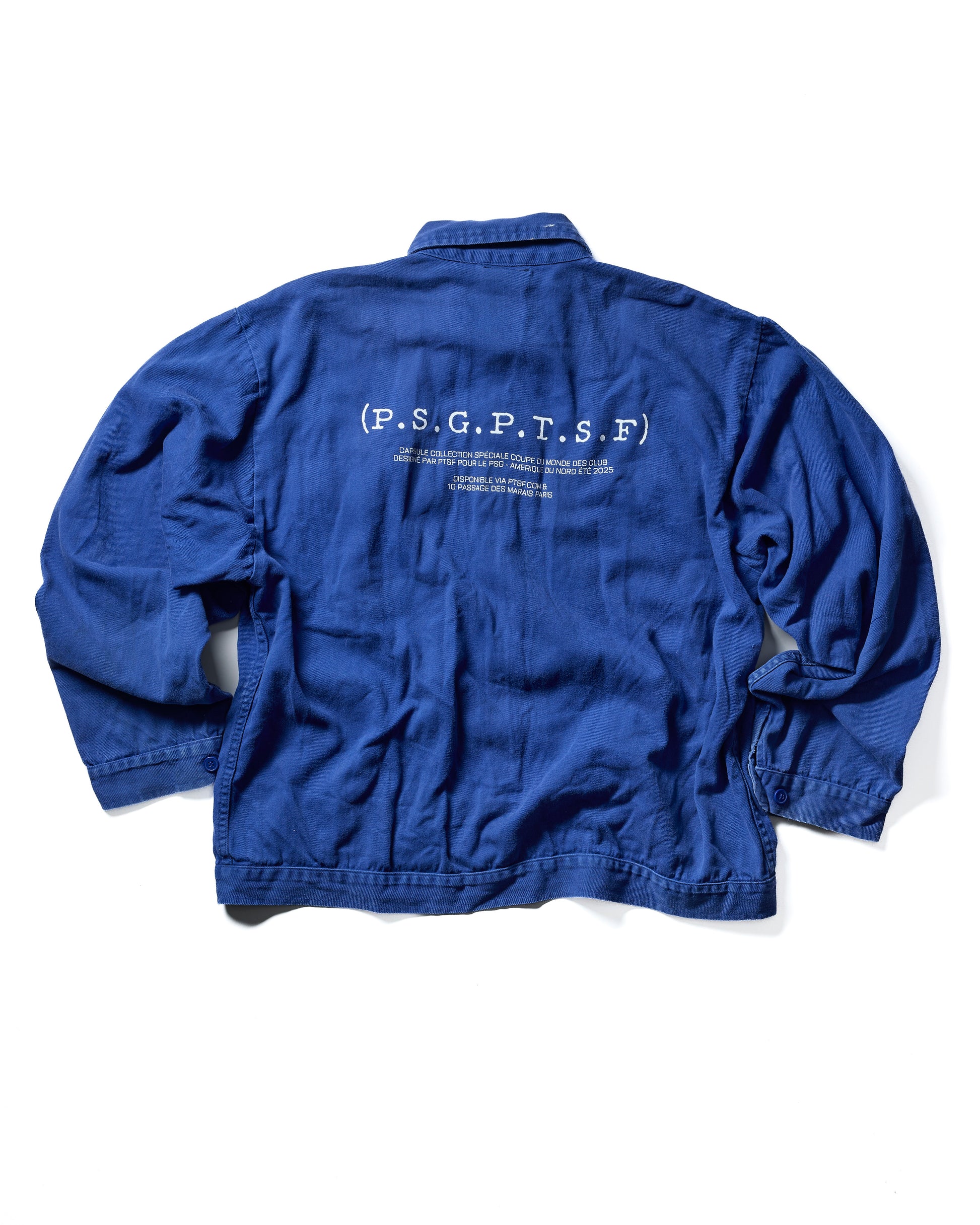 LE BLEU PSG est une veste imprimée en sérigraphie et brodée artisanalement, sur un bleu de travail vintage sourcé à la main.